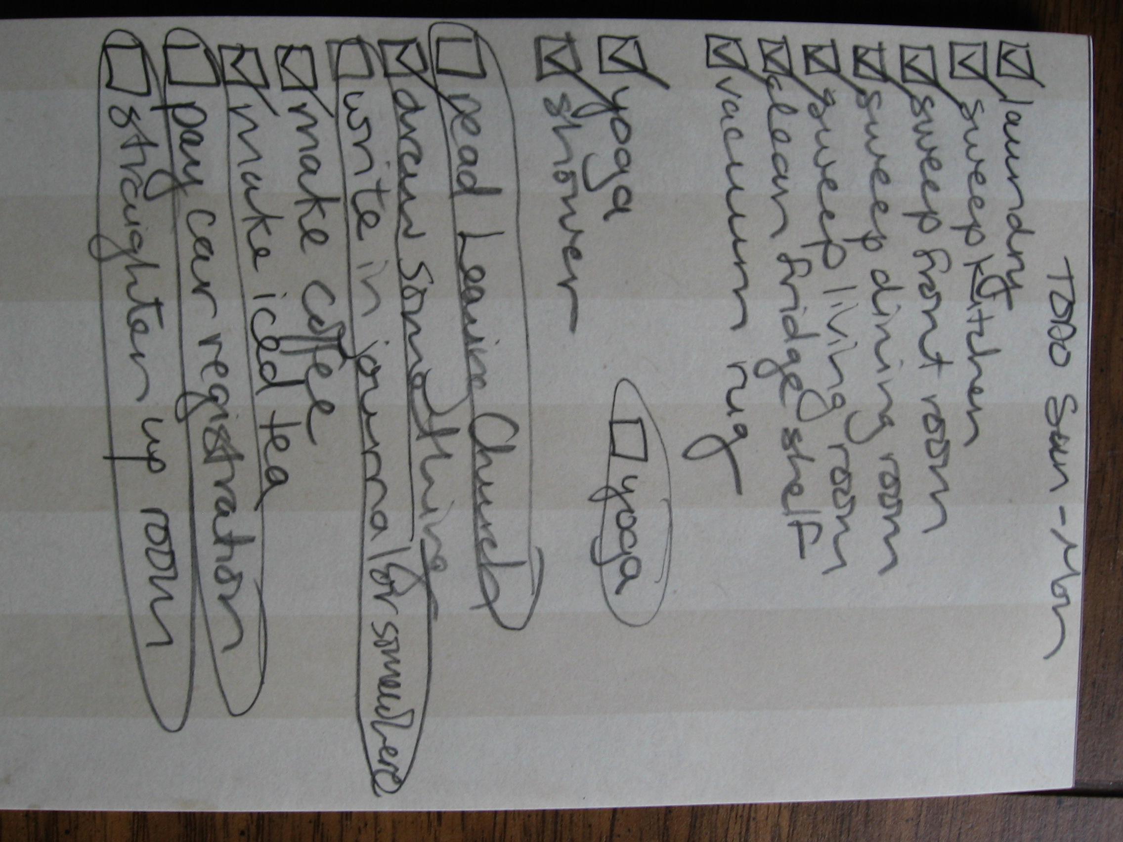 2) Include one or two items of house cleaning on the list. I  realized that doing a little cleaning every day is really good for my peace of mind. My environment is important to me, and I can sit down and pray or write or draw much more happily if the room I’m sitting in is neat and clean. I also took up yoga this year, and there’s nothing like lying on a mat on your living room floor to bring the multiple dust bunnies to your attention.